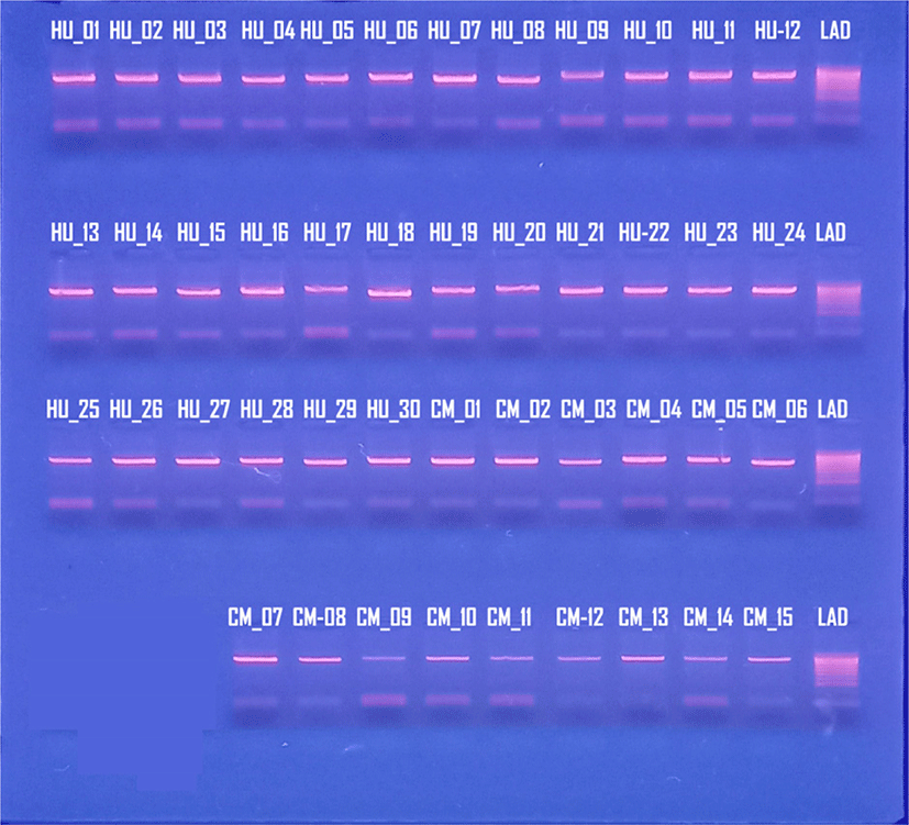 The products of PCR amplification were tested by electrophoresis on agarose gel (Fig. 2). Only one amplicon of each sample was produced within the theoretical range (700–1,000 bp).