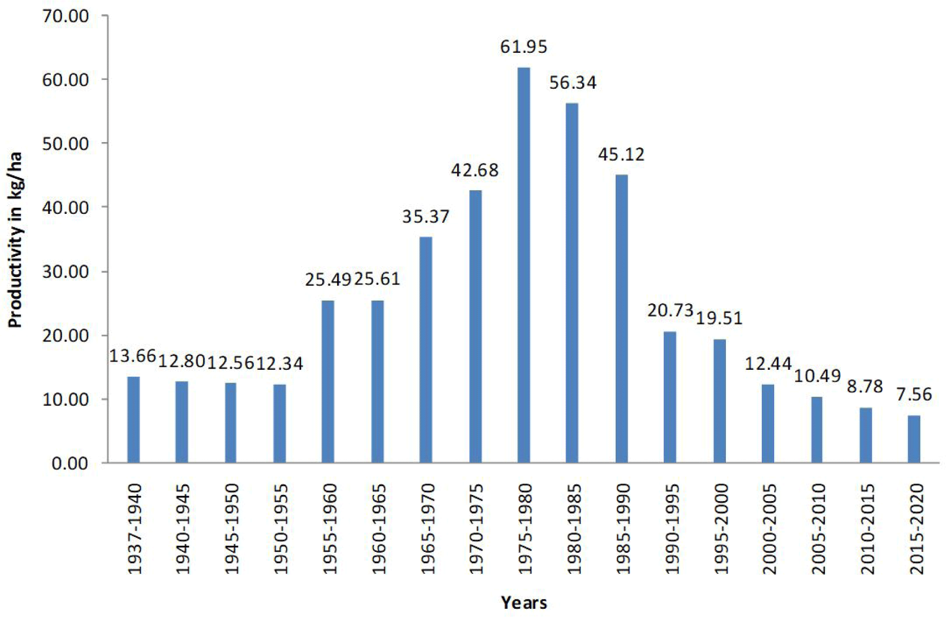The trend of productivity of lagoon ecosystem in terms to kg/ha is presented in Fig. 4, where the maximum value of 61.95 kg/ha is recorded in period of 1975–80, while the lower value of 31 kg/ha in year 2020 although as mentioned above the fish data has to be critically considered (Crivelli et al., 1996).