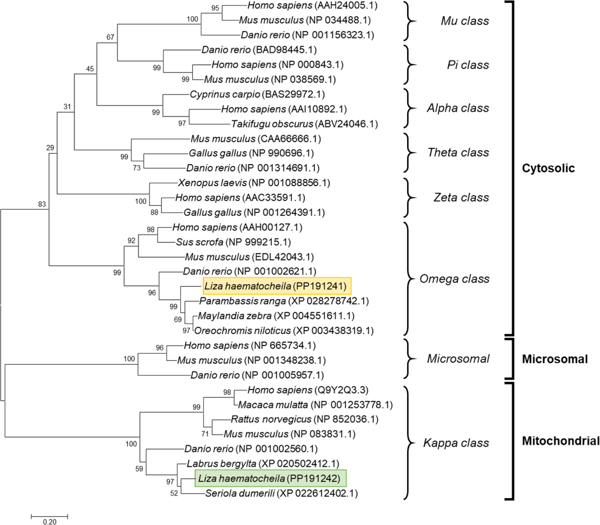 The redlip mullet (Liza haematocheila) is a widely distributed species in the North-Western Pacific Ocean. In general, redlip mullet are known to live in estuaries, exhibiting euryhaline behavior and migrating between brackish water and freshwater, while tolerating extreme temperatures. Owing to its rapid growth and high economic value, redlip mullet is the dominant mariculture species in China and Korea. However, high mortality from diseases caused by Lactococcus garvieae leads to substantial economic losses on mullet farms (Han et al., 2015). To date, several studies have been carried out on redlip mullet to understand the impact of L. garvieae on pathology and immune defense mechanisms (Harasgama et al., 2022). However, research on GSTs related with immune response in mullet has not yet been conducted. Therefore, the present study aimed to assess the redox reactions and immune responses of the omega and kappa classes of GST from redlip mullet.