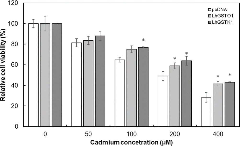 An agar-well diffusion assay was performed to compare the survival efficacy of transformed E. coli (BL21) with that of the pMAL-c5X vector and transformed E. coli (BL21) with the recombinant plasmids of LhGSTO1 or LhGSTK1 under heavy metal exposure. For the overexpression of the protein, the transformed E. coli were cultured in Luria-Bertani (LB; Miller, WI, USA) broth supplemented with 0.2% glucose until it reached 0.6 absorbance at 600 nm. The proteins were induced with 0.3 mM IPTG. The bacterial cells were spread onto LB agar plates. Subsequently, 3 mm disks were placed in LB agar plates, which were filled with 10 μL of 1 M CdCl2, 1 M CuSO4, and 1 M ZnCl2. The clearance zones were measured after overnight incubation at 37°C.