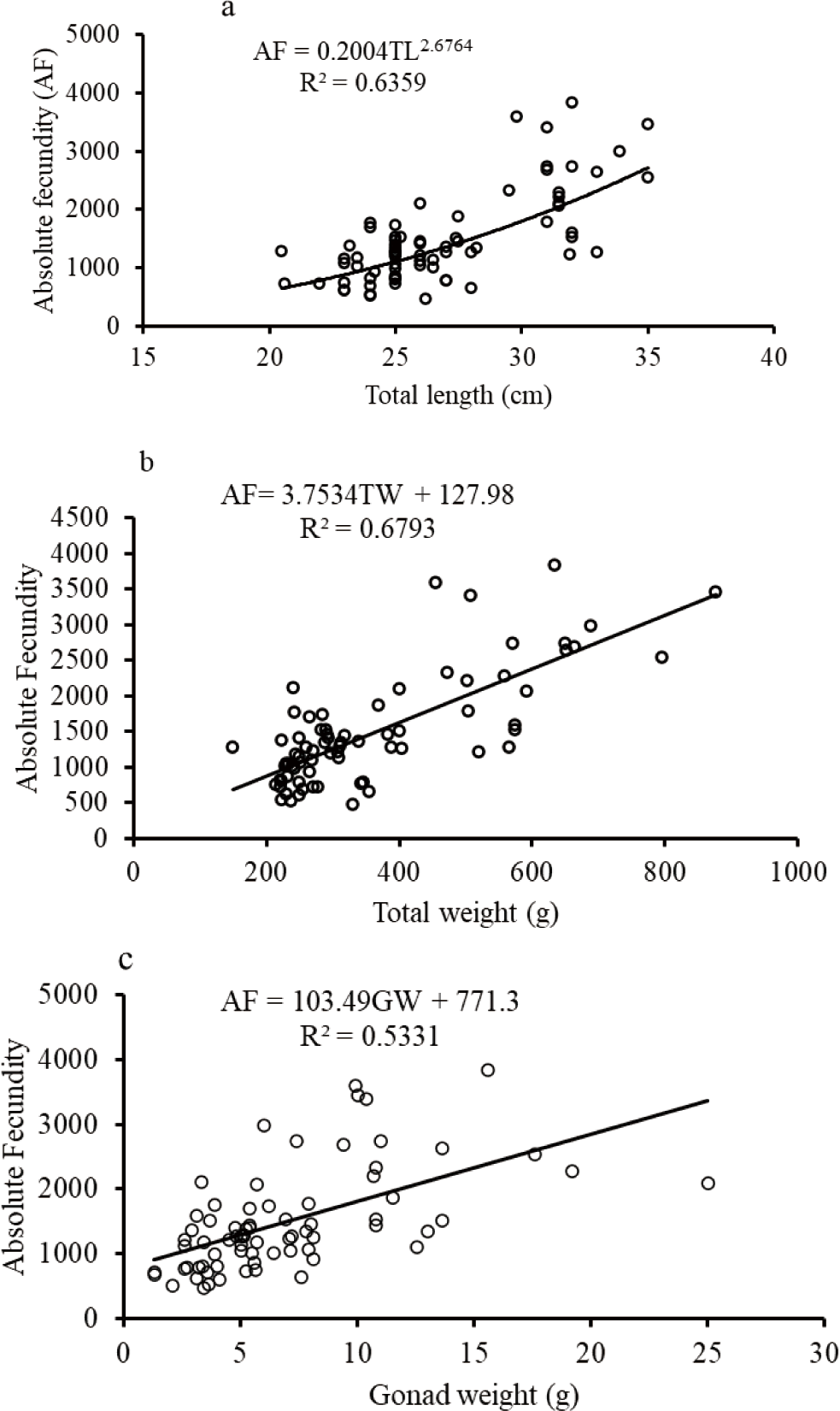 The relationships of absolute fecundity (AF) to TL or FL, AF to the TW, and AF to gonad weight (GW) were assessed using the least-squares regression method.